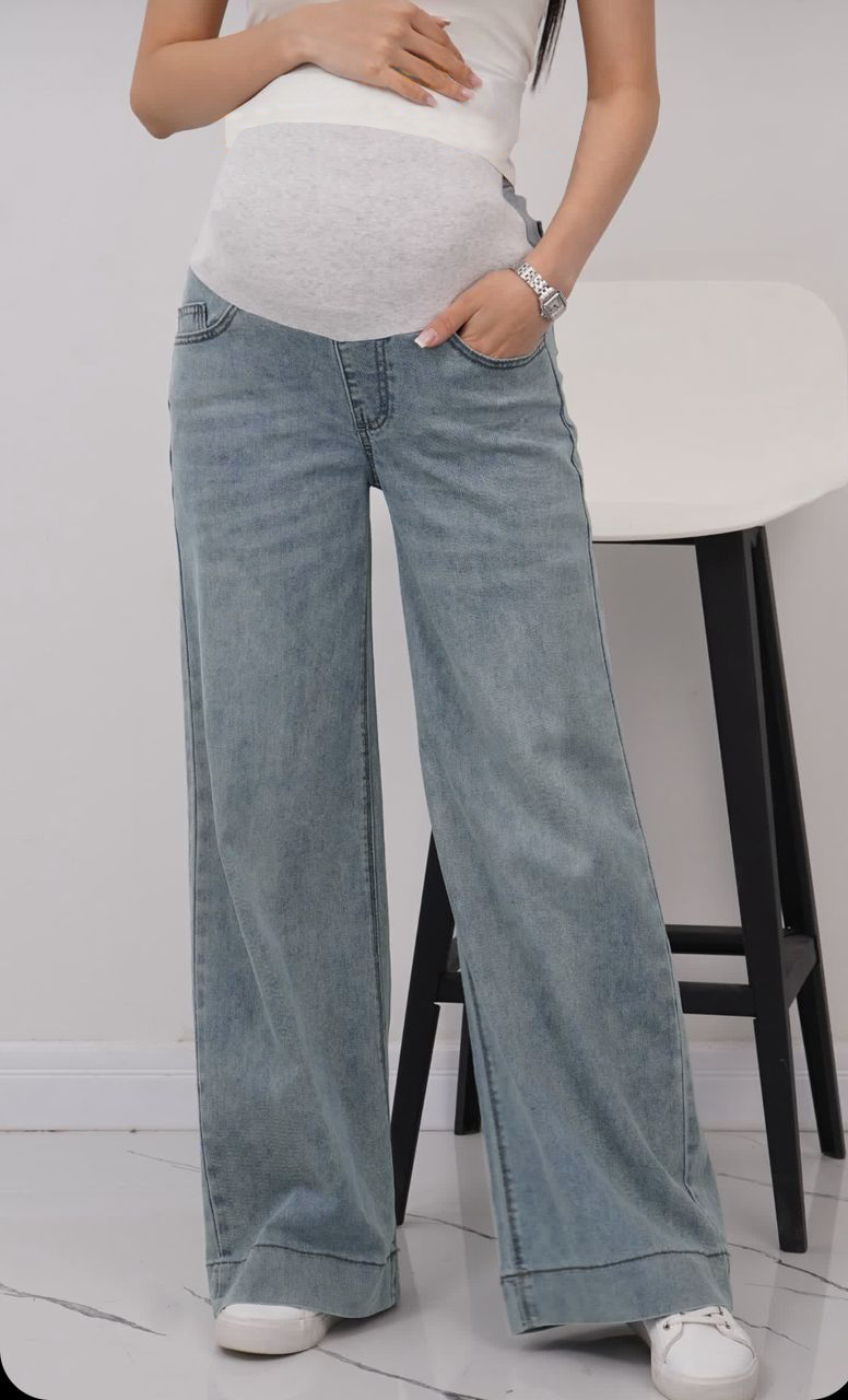 Джинсы для беременных голубого оттенка в модном стиле палаццо. Свободная модель из хлопкового денима отличный вариант для будущей мамы.