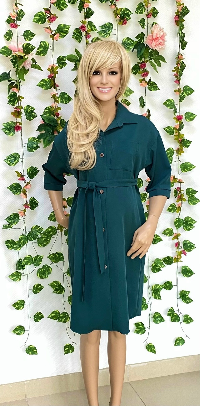 Стильное платье рубашечного кроя - настоящая находка, как для высоких, так и для невысоких модниц. Стиль рубашки с воротником позволяет использовать платье, как повседневное платье на каждый день, а также в деловом офисном образе. Модель имеет рубашечный воротник, переходящий в планку на контрастных пуговицах по всей длине. Плечо спущено, на груди накладные карманы.